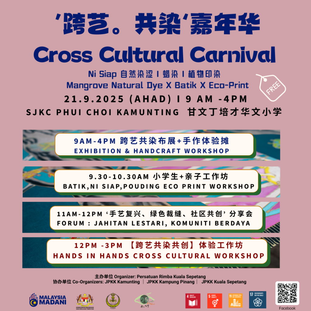 嘉年华不只展出红树皮自然染涩结合蜡染与植物印染的创作品,同时有手作摊和免费体验各种手作活动比如龙香、粘土、折篮子等。当天活动流程如下: